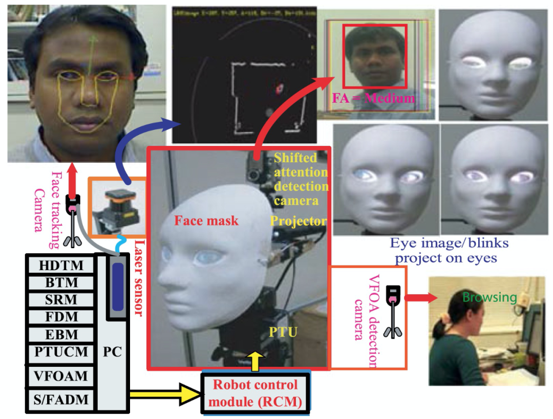 为了建立一个交流通道,机器人需要让目标人注意到它正看着她 / 他。机器人应该能够通过一些动作(例如面部表情、眨眼或点头)来表达它的这个意识。本文通过眨眼来产生这种意识,因为眨眼是形成一个人印象的最重要的线索之一。机器人通过完成眨眼的动作,能够使目标人感受到他 / 她正在被机器人注视。