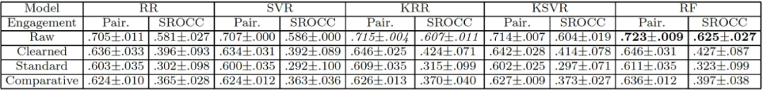 表 1. 基于 5 倍交叉验证和交叉模态特征的具有标准误差的参与预测模型的成对精度(Pair.)和 Spearman 秩相关系数(SROCC)