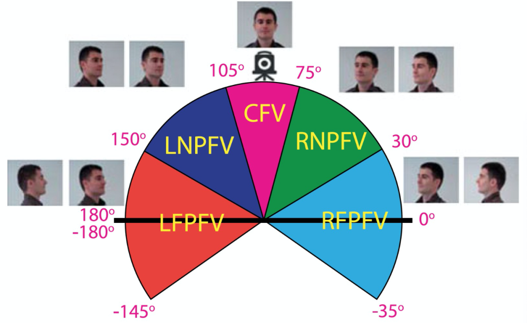 图 2. 头部方位分为五个角区域,其中使用的人脸图像来自远 GTAV 人脸数据库 [3]。