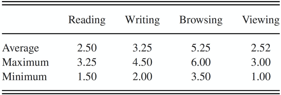 为了测量 VFOA 的持续时间,作者观看录制的视频数据,并手动标注(使用暂停和重新开始)参与者在没有失去注意力的情况下对任务产生一致结果的时间段。当受试者将当前的 VFOA 转向另一个方向时,就会出现注意力丧失的情况。对于阅读和写作,参与者分别在「翻页」和「停止写作」时失去注意力。对于阅读、写作、浏览和观看绘画的任务,分别检测到 14 次、10 次、9 次和 12 次注意力的丧失情况。根据这些情况的持续时间,估计得到了每个任务的 VFOA 时间跨度(见表 1)。