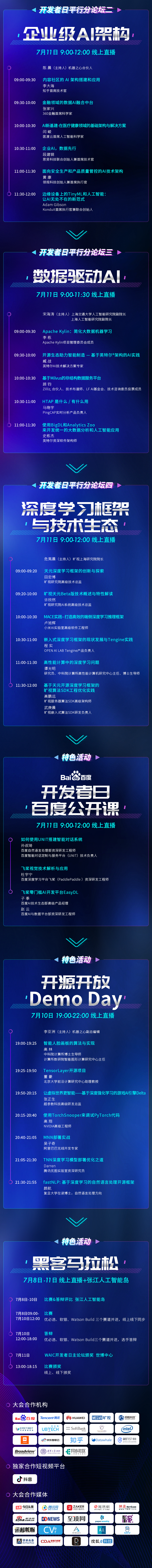 大环节,包括1场主论坛、4场分论坛、1场高峰对话、1堂百度公开课、1场开源项目Demo Day,1场黑客马拉松,这是一次丰富多元的学习之旅。