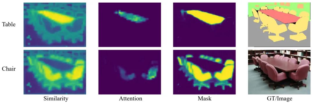 在这里,本文采用Attention对 进行逐步更新。需要注意的是:Attention通过Softmax函数聚焦于具有高相似性的token聚合。然而,作者认为:具有最大相似性的token同样非常有意义。基于该假设,作者构建了一个轻量模块直接生成语义预测。具体来说,作者将 视作类分割任务的类嵌入信息, 则表示ViT骨干不同层的输出。对类嵌入中的每个token搭配一个语义Mask以表征每个类别的语义预测,该计算表示如下: