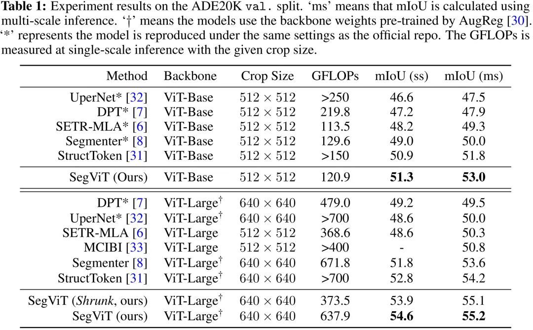 SegViT-Shrunk取得了49.4%mIoU指标,参数量仅为224.8GFLOPs。