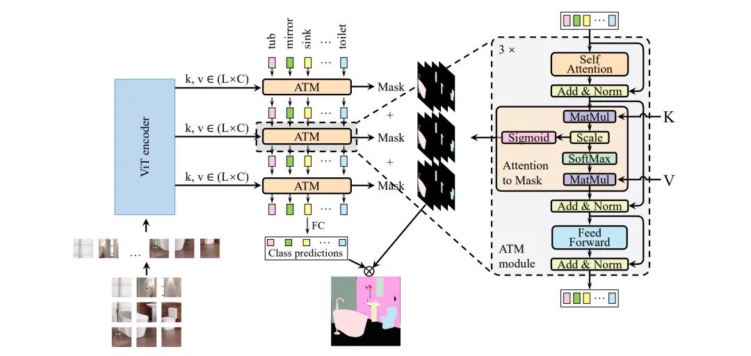 注意力机制中的Q与K的点乘操作用于计算两者之间的相似性,而在语义分割中同类区域特征应与其对应类别具有更大的相似性,上图则很好的说明了特征与类别之间的相似性。在Attention的基础上,简单的添加Sigmoid操作即可将相似性图转换为Mask。受此启发,作者设计了一种用于语义分割的ATM模块,并将其与朴素ViT的组合称之为SegViT。