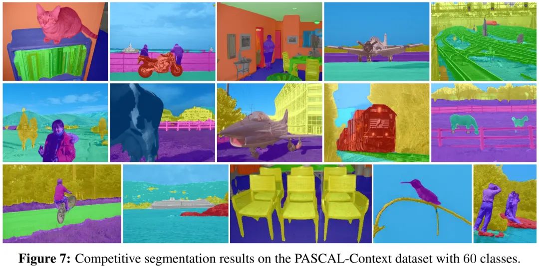 上表与图给出了PASCAL-Context数据集上的指标与可视化效果,从中可以看到:所提方案取得了65.3%mIoU指标(带背景类别)、59.3%mIoU指标(不带背景类别),达成了新的SOTA指标。