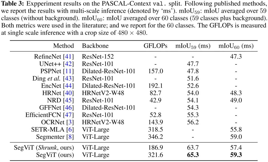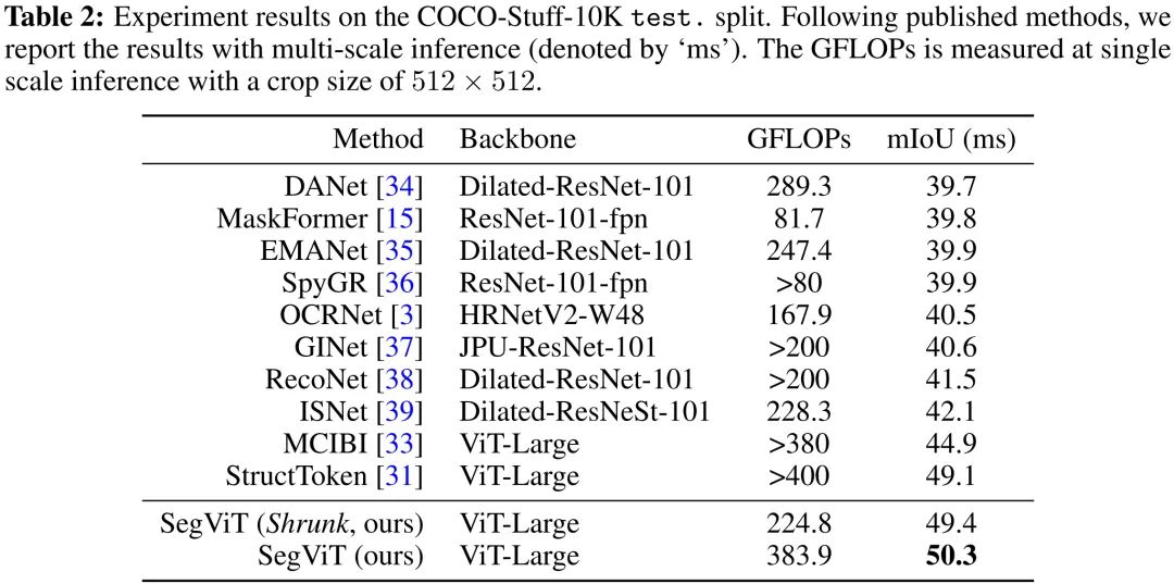 SegViT-Shrunk取得了55.1%mIoU,计算量相比SegViT-ViT节省40%。