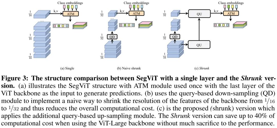 由于朴素ViT并不具备多阶段多尺度特征,FPN这种多尺度特征聚合方式就不再适用。那么,如何进行底层与高层特征聚合呢?作者基于ATM将ViT骨干不同位置的特征进行聚合并作为SegViT的Decoder模块。基于此,作者进一步引入了QD与QU构建了Shrunk版本的SegViT,在大幅降低计算量的同时保持同等性能。