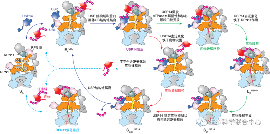 蛋白质降解调控是极其重要的基本生物化学过程,在细胞周期、信号转导、免疫响应、基因调控、新陈代谢、神经退行、癌症肿瘤、病毒感染以及蛋白毒性响应等主要细胞分子过程中发挥关键调控作用。在真核细胞中,绝大部分胞内蛋白都是通过泛素蛋白酶体途径(Ubiquitin-proteasome pathway),经过泛素化标记被蛋白酶体全酶降解的。2004年,Aaron Ciechanover, Irwin Rose和Avram Hershko三位科学家被授予了诺贝尔化学奖,以表彰他们对该泛素化通路介导蛋白质降解的历史性发现。蛋白酶体全酶,又称为26S proteasome,是由中间一个圆柱形20S核心颗粒和两端覆盖的一个或两个19S调节颗粒组成。19S包含一个环形异源六聚体马达——AAA-ATPase,通过多个协同ATP水解模式调控蛋白酶体降解泛素化底物。蛋白酶体功能紊乱与人体多种疾病相关,如癌症、神经退行性疾病和免疫疾病等。蛋白酶体是美国FDA批准的多种治疗癌症的上市小分子药物的直接靶标。在正常细胞中,蛋白酶体的功能受到多个水平的严格调控。去泛素化酶USP14是最主要的蛋白酶体调控分子,被认为是一个潜力巨大的治疗癌症和神经退行性疾病的重要靶标,其小分子抑制剂曾进入过美国一期临床研究,但围绕USP14功能机制的一系列悬而未决的关键问题极大限制了其靶向药物分子的开发和临床应用。USP14通过结合26S而被激活,然后以毫秒的时间尺度剪切底物上的泛素链。它是如何被蛋白酶体激活并调控蛋白酶体功能的,一直是全球研究机构和生物制药界期待解决的关键科学问题。