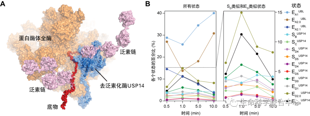 图1.(A)USP14调控下蛋白酶体复合体降解多泛素化底物的原子结构模型之一。(B)时间分辨率冷冻电镜解析13种中间态的统计分布随蛋白质降解进程的时间演化。(图片来源: YoudongMao, CC BY 4.0)