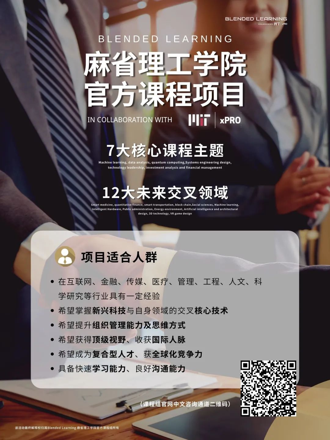 Blended Learning 是 MIT 最前沿的大型官方课程项目之一,由 MIT Open Learning (校级部门)旗下官方学习平台 MIT xPRO 领衔,2021 年,Blended Learning 正式纳入哈佛大学商学院(HBS)官方课程进入课程体系。