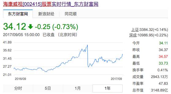 2017年9月6日海康威视的市值已经涨到3148亿元,市盈率47.83!
