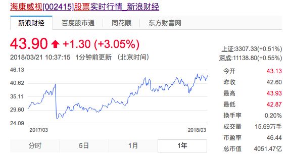 2018年3月21日海康威视的市值已经涨到4051亿元,市盈率46.44!