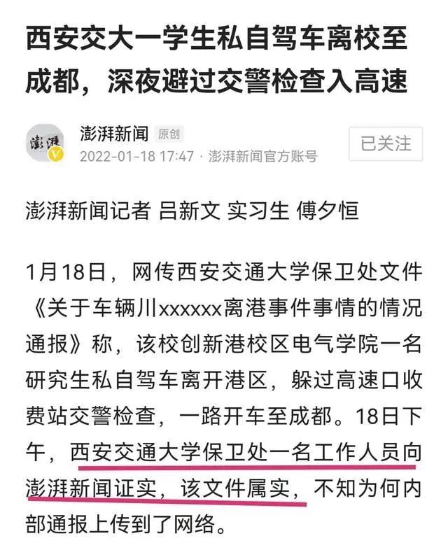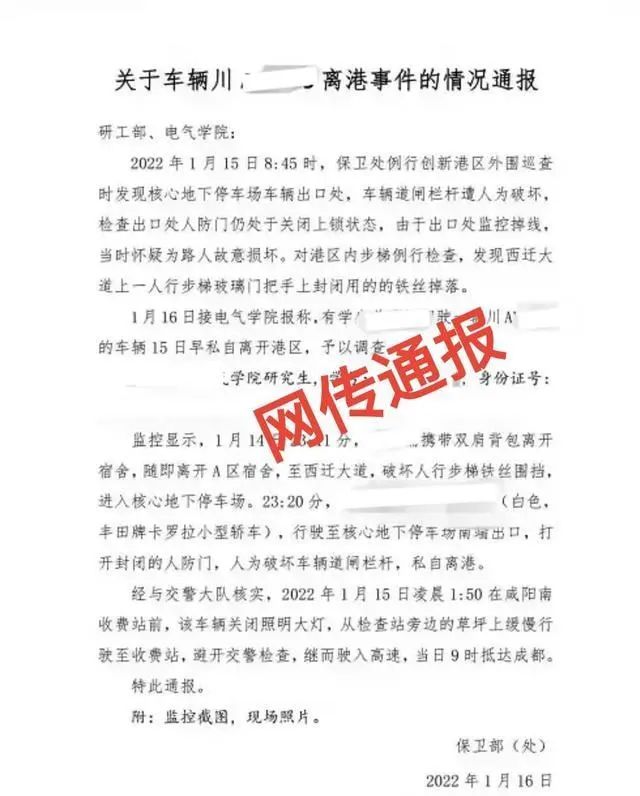1月18日,网传西安交通大学保卫处文件《关于车辆川xxxxxx离港事件事情的情况通报》称,
