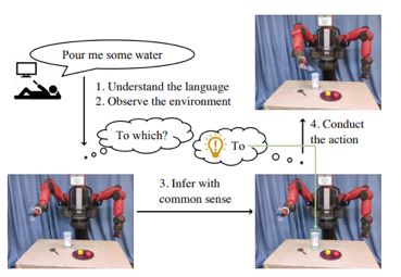 输入的语音是一个无限制自然语言的指令,该方法首先将指令进行转换,将其解析为机器人的动词框架能理解的形式。然后它通过观察指令周围的对象,并利用常识性推理来填补指令中缺失的信息。