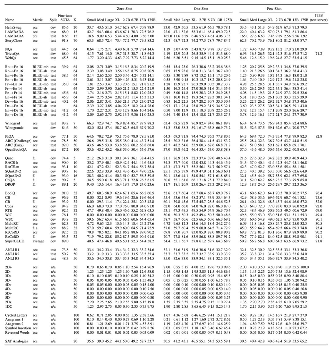 OpenAI 在多项任务中对 GPT-3 的性能进行了测试,包括语言建模、补全、问答、翻译、常识推理、SuperGLUE 等任务。