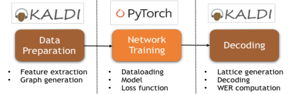 利用本研究中 PyChain 做端到端 LF-MMI 训练的 pipeline。