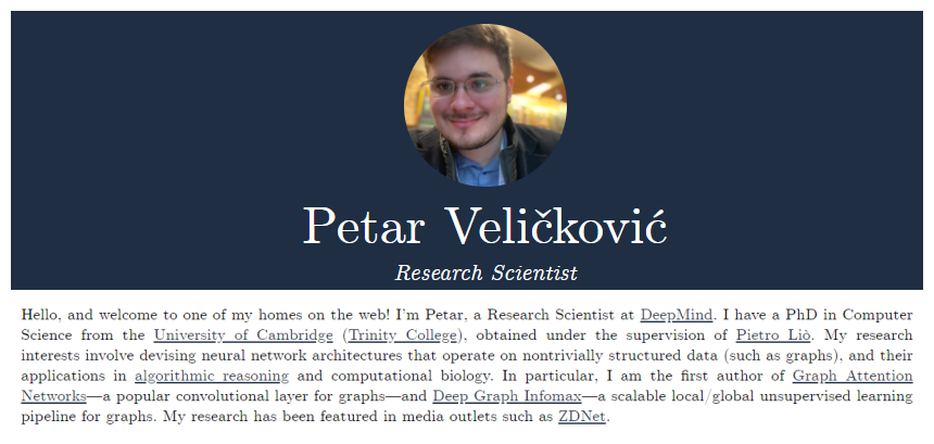 最为大家所熟知的是,Peter Veličković为图注意力网络(Graph Attention Network, GAT)和深度图信息最大化(Deep Graph Infomax, DGI)的第一作者。