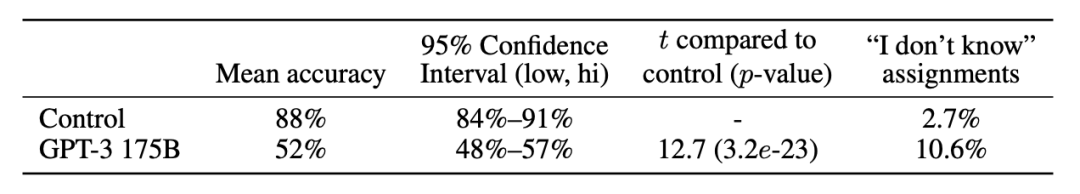 人类对 GPT-3 175B 模型生成的约 500 词文章的判断准确率为 52%,不过相比于 GPT-3 control 模型(没有语境和不断增加的输出随机性且只具备 1.6 亿参数的模型),GPT-3 175B 生成的文本质量要高得多。