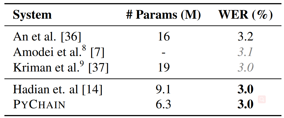 在 WSJ 数据集上的实验表明,利用简单的神经网络和常用的机器学习方法,PyChain 可以实现媲美 Kaldi 甚至优于其他端到端 ASR 系统的结果。