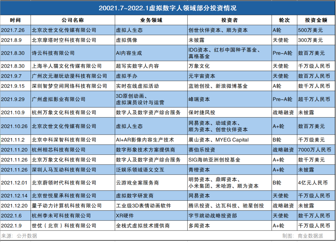 在国内,据不完全统计,自2021年7月以来,一级市场虚拟人相关的核心投融资事件已达到18次。