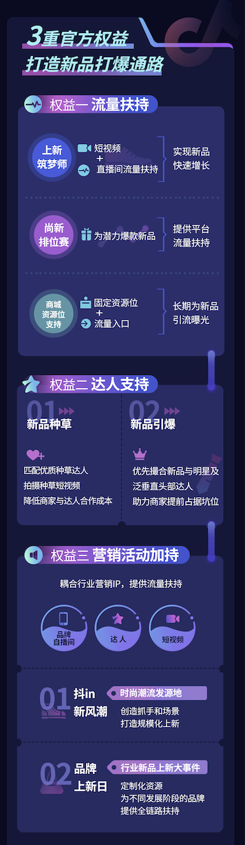 比如今年三月底刚推出的百万新品计划,我们就会把新品分成A、B、C、D四个档位,进行有效评估和分级运营。不仅会为商家的直播间、短视频内容推荐导流,撮合风格合适的达人资源进行推广,还会通过各类营销活动为品牌做曝光。