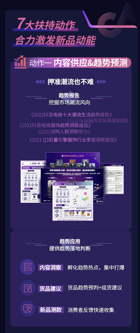 比如我们发现,一款新品是否能够踩中当下趋势、消费者的需求可能是决定了新品命中率的一个重要因素。那么我们站在平台方就会从内容入手去洞察消费者的需求、挖掘市场潮流风向,同时也会有多种方式去帮助商家把落地、应用当下的趋势。