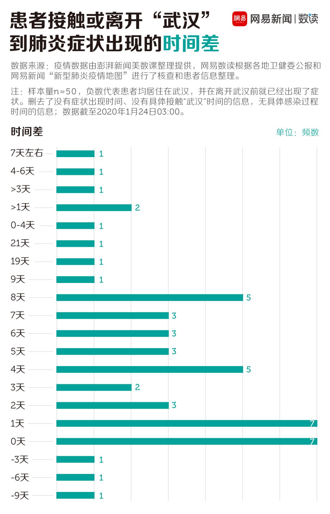 由于湖北病例数量多,公布的确诊信息很少有患者的具体信息。所以我们对其他省份有较详细信息的确诊或疑似患者案例进行了分析,结果显示,大部分接触过“武汉”的患者都在当天或次日出现症状,不过因人而异,也有在接触“武汉”间隔多天后才出现症状的情况,少部分人出现症状时间较晚,有4-6天的,也有1周左右的。