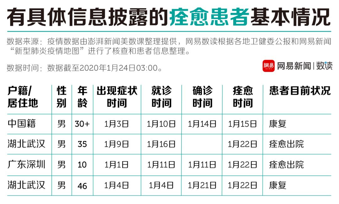 相较而言,公布详细治愈信息的2名武汉患者、1名深圳患者及1名在日中国籍患者的年纪都不算太大,最低仅10岁,从出现疑似病症到治愈基本在半个月左右。