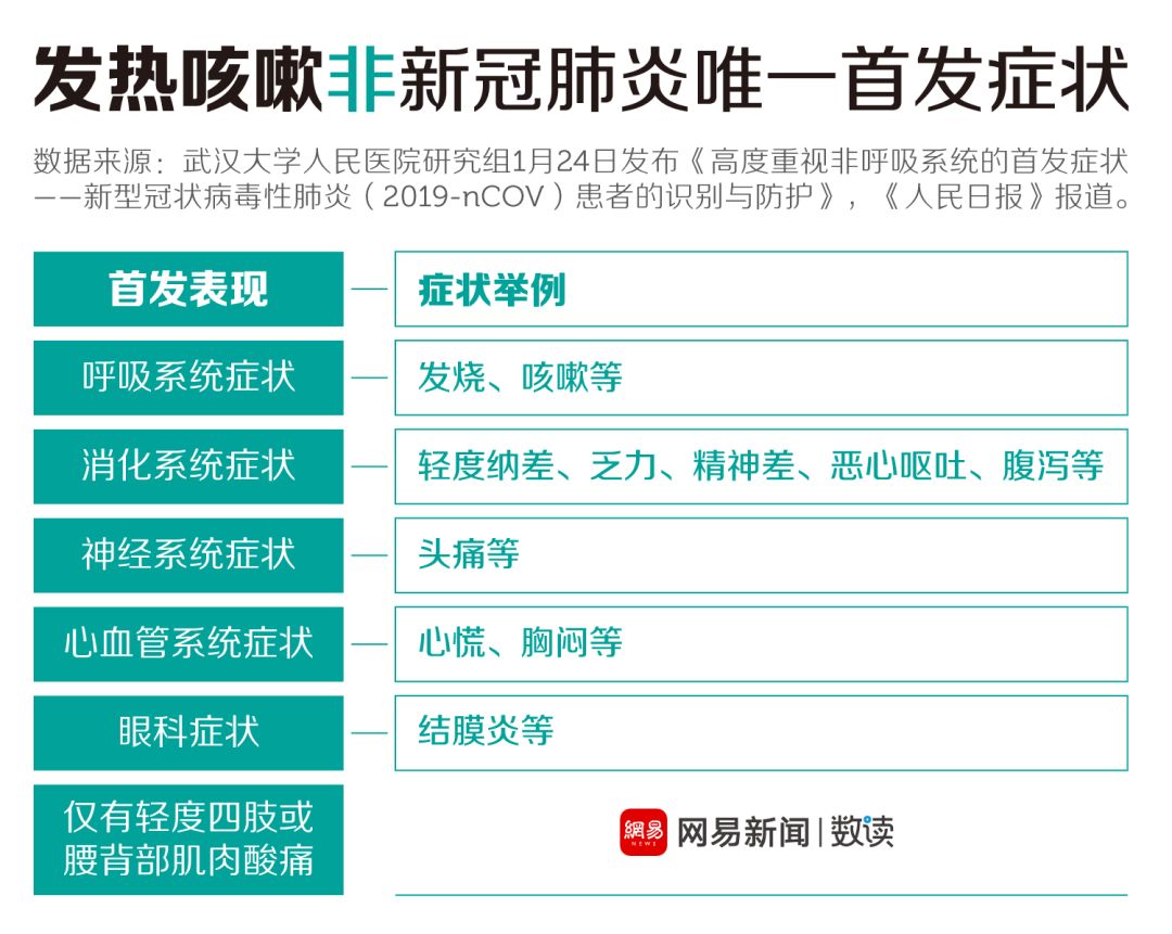 而今天武汉大学人民医院研究组发布的新型冠状病毒肺炎患者识别“升级版”显示,发热咳嗽等呼吸系统症状并非唯一的首发症状,目前已发现多个“不典型”病例,以消化系统、神经系统、心血管系统症状与眼科症状等为首发表现,也有病例仅有轻度四肢或腰背部肌肉酸痛。[1]