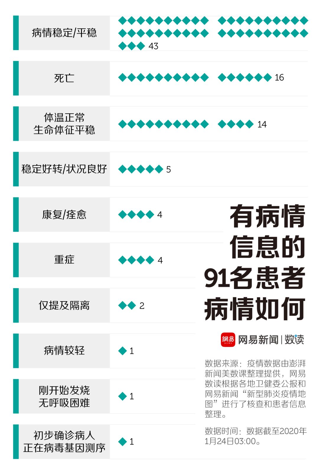 通过查阅各地卫健委的公报,截至2020年1月24日凌晨3时,共有91名确诊或疑似患者有病情信息。