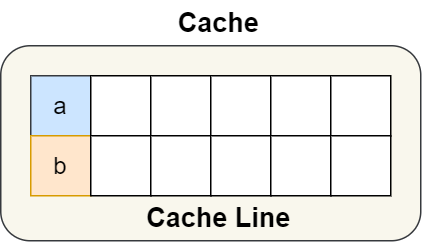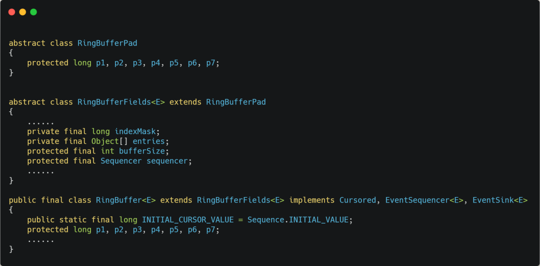 因此,针对在同一个 Cache Line 中的共享的数据,如果在多核之间竞争比较严重,为了防止伪共享现象的发生,可以采用上面的宏定义使得变量在 Cache Line 里是对齐的。举个例子,有下面这个结构体:结构体里的两个成员变量 a 和 b 在物理内存地址上是连续的,于是它们可能会位于同一个 Cache Line 中,如下图:所以,为了防止前面提到的 Cache 伪共享问题,我们可以使用上面介绍的宏定义,将 b 的地址设置为 Cache Line 对齐地址,如下:这样 a 和 b 变量就不会在同一个 Cache Line 中了,如下图:所以,避免 Cache 伪共享实际上是用空间换时间的思想,浪费一部分 Cache 空间,从而换来性能的提升。我们再来看一个应用层面的规避方案,有一个 Java 并发框架 Disruptor 使用「字节填充 + 继承」的方式,来避免伪共享的问题。Disruptor 中有一个 RingBuffer 类会经常被多个线程使用,代码如下:你可能会觉得 RingBufferPad 类里 7 个 long 类型的名字很奇怪,但事实上,它们虽然看起来毫无作用,但却对性能的提升起到了至关重要的作用。我们都知道,CPU Cache 从内存读取数据的单位是 CPU Line,一般 64 位 CPU 的 CPU Line 的大小是 64 个字节,一个 long 类型的数据是 8 个字节,所以 CPU 一下会加载 8 个 long 类型的数据。根据 JVM 对象继承关系中父类成员和子类成员,内存地址是连续排列布局的,因此 RingBufferPad 中的 7 个 long 类型数据作为 Cache Line 前置填充,而 RingBuffer 中的 7 个 long 类型数据则作为 Cache Line 后置填充,这 14 个 long 变量没有任何实际用途,更不会对它们进行读写操作。另外,RingBufferFelds 里面定义的这些变量都是 final 修饰的,意味着第一次加载之后不会再修改, 又由于「前后」各填充了 7 个不会被读写的 long 类型变量,所以无论怎么加载 Cache Line,这整个 Cache Line 里都没有会发生更新操作的数据,于是只要数据被频繁地读取访问,就自然没有数据被换出 Cache 的可能,也因此不会产生伪共享的问题。