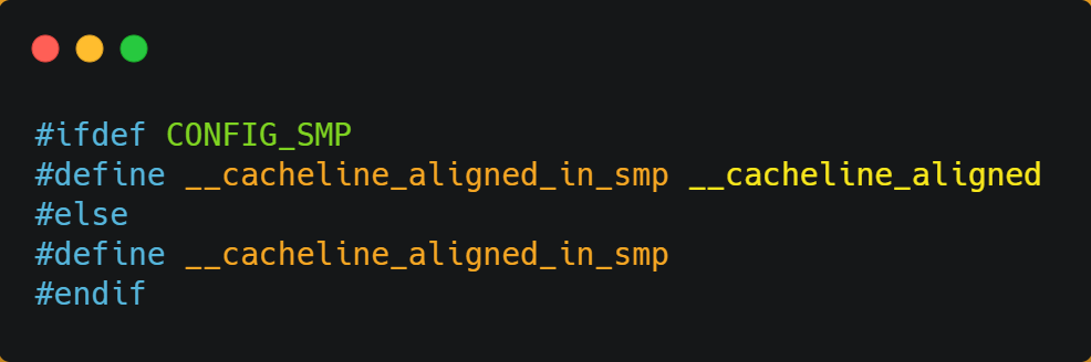 因此,对于多个线程共享的热点数据,即经常会修改的数据,应该避免这些数据刚好在同一个 Cache Line 中,否则就会出现为伪共享的问题。接下来,看看在实际项目中是用什么方式来避免伪共享的问题的。在 Linux 内核中存在 __cacheline_aligned_in_smp 宏定义,是用于解决伪共享的问题。从上面的宏定义,我们可以看到: