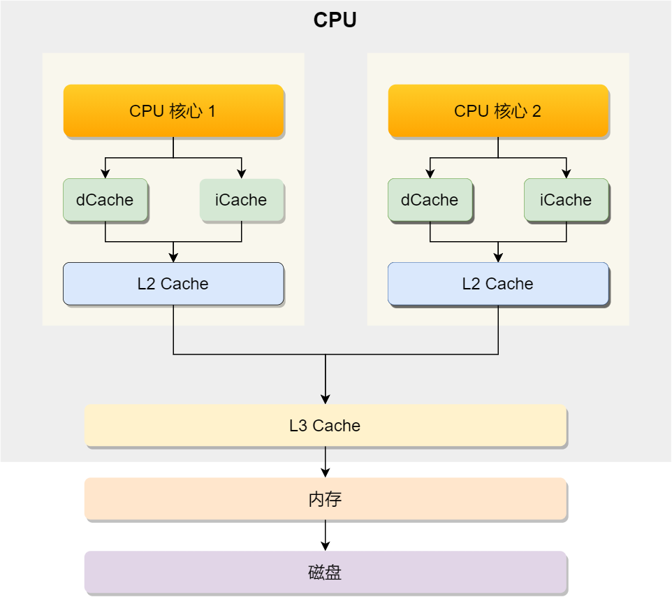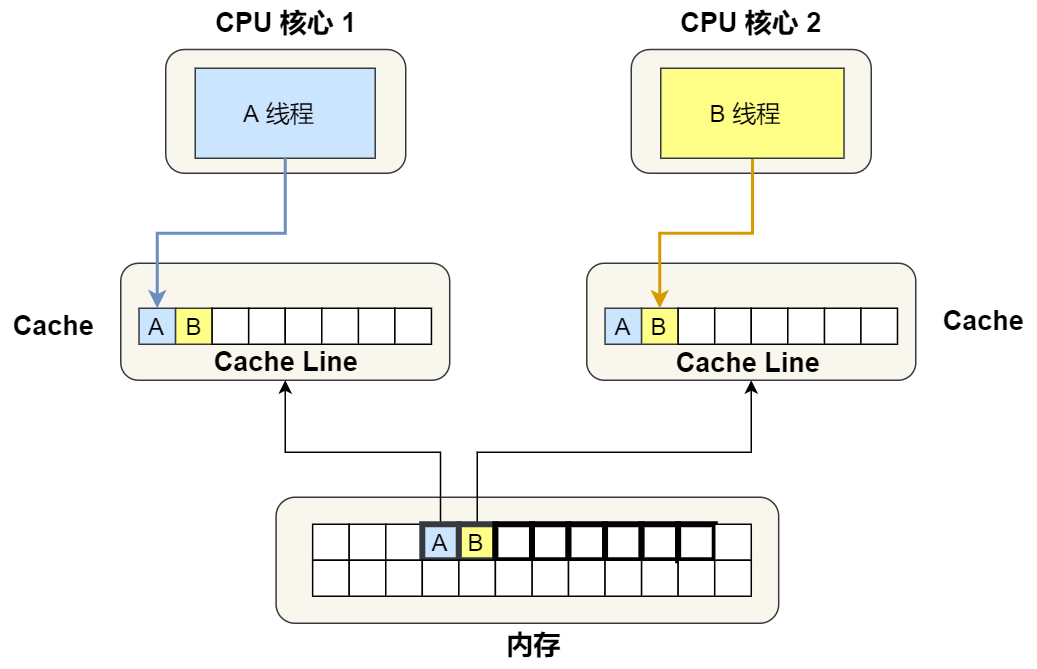 先来认识 CPU 的架构,只有理解了 CPU 的 架构,才能更好地理解 CPU 是如何读写数据的,对于现代 CPU 的架构图如下:可以看到,一个 CPU 里通常会有多个 CPU 核心,比如上图中的 1 号和 2 号 CPU 核心,并且每个 CPU 核心都有自己的 L1 Cache 和 L2 Cache,而 L1 Cache 通常分为 dCache(数据缓存) 和 iCache(指令缓存),L3 Cache 则是多个核心共享的,这就是 CPU 典型的缓存层次。上面提到的都是 CPU 内部的 Cache,放眼外部的话,还会有内存和硬盘,这些存储设备共同构成了金字塔存储层次。如下图所示:从上图也可以看到,从上往下,存储设备的容量会越大,而访问速度会越慢。至于每个存储设备的访问延时,你可以看下图的表格:你可以看到, CPU 访问 L1 Cache 速度比访问内存快 100 倍,这就是为什么 CPU 里会有 L1~L3 Cache 的原因,目的就是把 Cache 作为 CPU 与内存之间的缓存层,以减少对内存的访问频率。CPU 从内存中读取数据到 Cache 的时候,并不是一个字节一个字节读取,而是一块一块的方式来读取数据的,这一块一块的数据被称为 CPU Line(缓存行),所以 CPU Line 是 CPU 从内存读取数据到 Cache 的单位。至于 CPU Line 大小,在 Linux 系统可以用下面的方式查看到,你可以看我服务器的 L1 Cache Line 大小是 64 字节,也就意味着 L1 Cache 一次载入数据的大小是 64 字节。那么对数组的加载, CPU 就会加载数组里面连续的多个数据到 Cache 里,因此我们应该按照物理内存地址分布的顺序去访问元素,这样访问数组元素的时候,Cache 命中率就会很高,于是就能减少从内存读取数据的频率, 从而可提高程序的性能。但是,在我们不使用数组,而是使用单独的变量的时候,则会有 Cache 伪共享的问题,Cache 伪共享问题上是一个性能杀手,我们应该要规避它。接下来,就来看看 Cache 伪共享是什么?又如何避免这个问题?现在假设有一个双核心的 CPU,这两个 CPU 核心并行运行着两个不同的线程,它们同时从内存中读取两个不同的数据,分别是类型为 long 的变量 A 和 B,这个两个数据的地址在物理内存上是连续的,如果 Cahce Line 的大小是 64 字节,并且变量 A 在 Cahce Line 的开头位置,那么这两个数据是位于同一个 Cache Line 中,又因为 CPU Line 是 CPU 从内存读取数据到 Cache 的单位,所以这两个数据会被同时读入到了两个 CPU 核心中各自 Cache 中。我们来思考一个问题,如果这两个不同核心的线程分别修改不同的数据,比如 1 号 CPU 核心的线程只修改了 变量 A,或 2 号 CPU 核心的线程的线程只修改了变量 B,会发生什么呢?