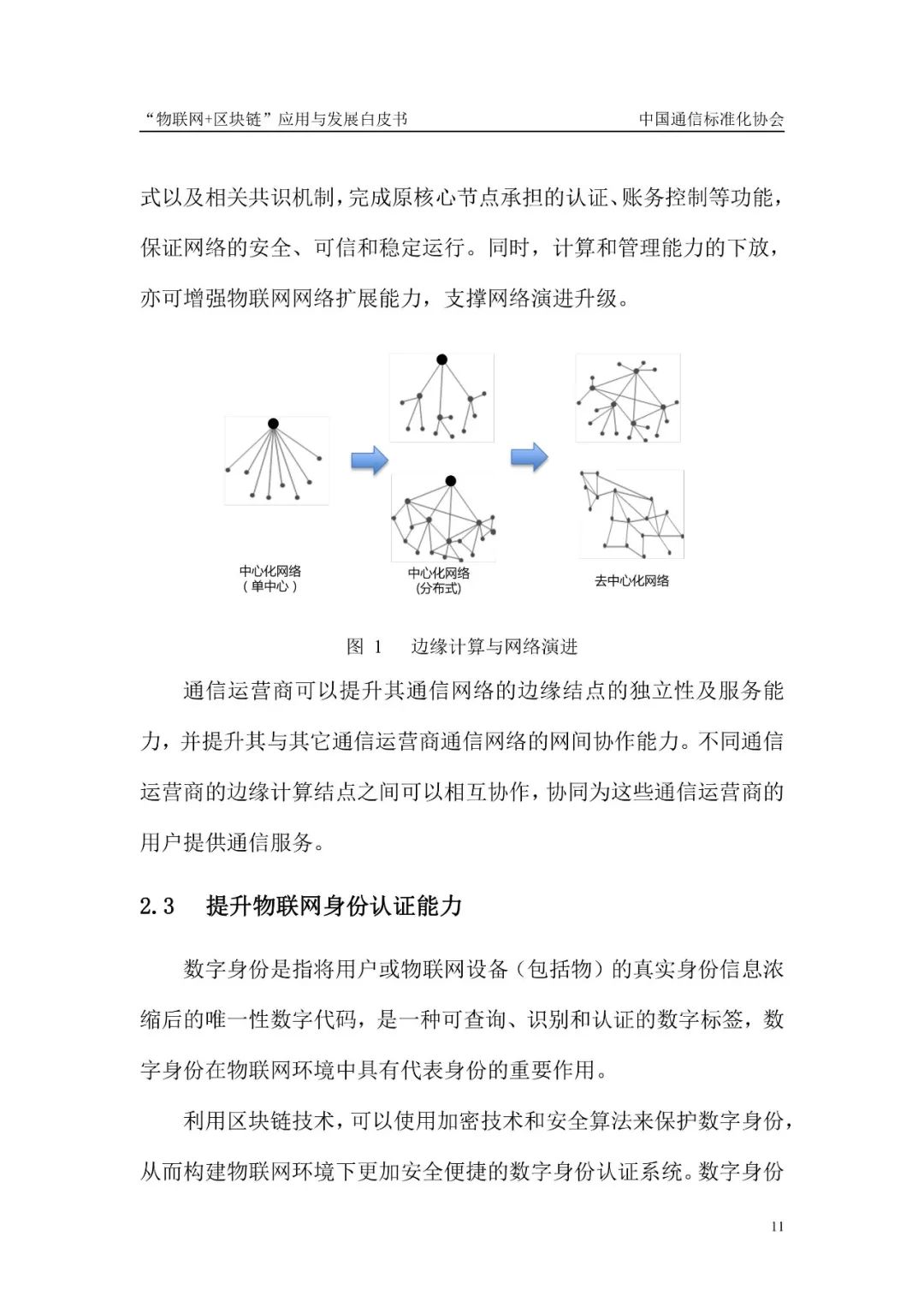 • 网间协作:区块链的分布式架构和主体对等的特点有助于打 破物联网现存的多个信息孤岛桎梏,以低成本建立互信,促进 信息的横向流动和网间协作。