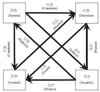 这4个层面之间的逻辑关系如下图所示, 其中系统层面通过体系架构的限定作用对决策和控制形成了约束, 同时对信息安全层面的问题具有诱导作用; 安全层面对整个系统的信息安全具有支撑作用, 对决策与控制过程形成信息保护; 决策层面对控制层面具有引导作用, 而控制层面主要是对决策的实现, 同时对决策层面也具有一定的约束作用.