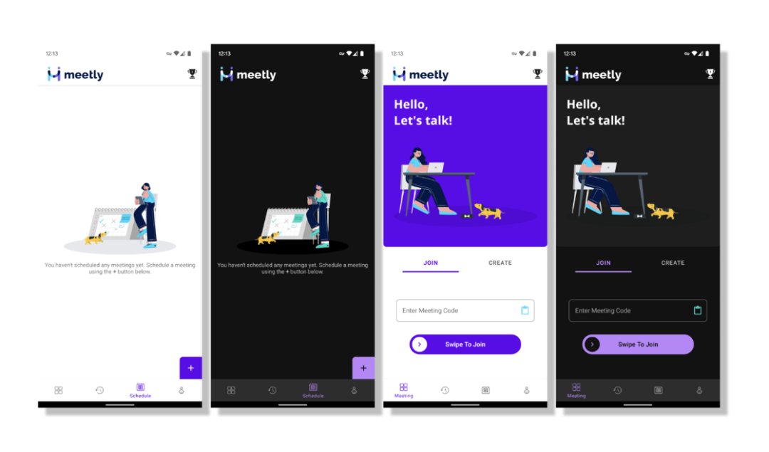 在设计师 Kinjal Waghela 的主导下,Meetly 的近期版本更新的重新设计采用了暗色主题优先的方法,使产品在整个界面的色彩应用上脱颖而出,传达了Meetly的身份,同时提高了在黑暗环境中的可读性。