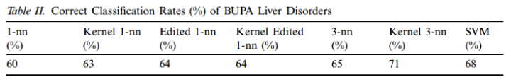 在不同的数据集上,核化 kNN 都能比传统 kNN 表现的更精确和稳定,他们使用 US Postal Service 数据和 BUPA Live Disorder 数据进行了验证,结果表明核化过的 kNN 分类器精度明显好于传统的 kNN,和 SVM 有得一拼: