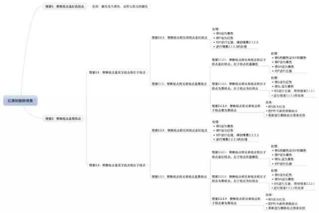 综上所述,删除操作删除的结点可以看作删除替代结点,而替代结点最后总是在树末。有了这结论,我们讨论的删除红黑树的情景就少了很多,因为我们只考虑删除树末结点的情景了。