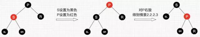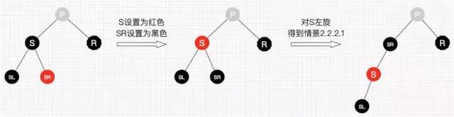 兄弟结点所在的子树有红结点,我们总是可以向兄弟子树借个红结点过来,显然该情景可以转换为情景2.1.2.1。图如23所示。