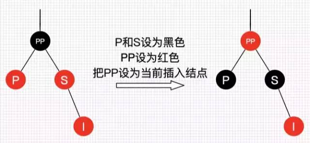 可以看到,我们把PP结点设为红色了,如果PP的父结点是黑色,那么无需再做任何处理;但如果PP的父结点是红色,根据性质4,此时红黑树已不平衡了,所以还需要把PP当作新的插入结点,继续做插入操作自平衡处理,直到平衡为止。
