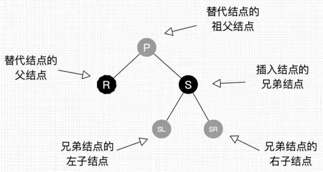 图20的字母并不代表结点Key的大小。R表示替代结点,P表示替代结点的父结点,S表示替代结点的兄弟结点,SL表示兄弟结点的左子结点,SR表示兄弟结点的右子结点。灰色结点表示它可以是红色也可以是黑色。