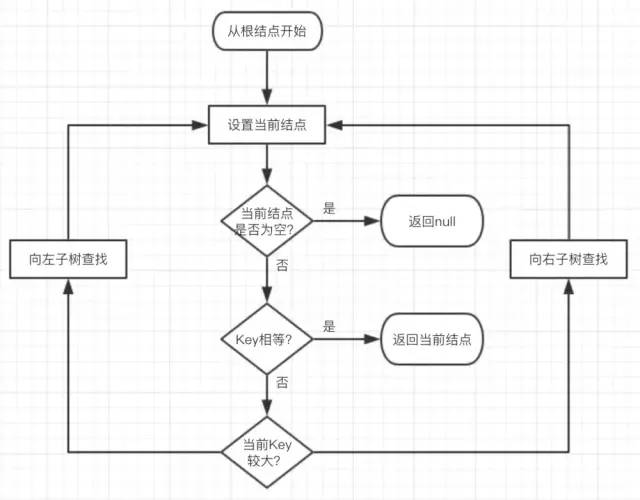若当前结点key小于查找key,把当前结点的右子结点设置为当前结点,重复步骤2;