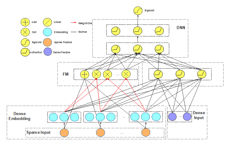 该DeepFM算法与华为设计的DeepFM不同,改模型将FM层的结果作为DNN的输入。