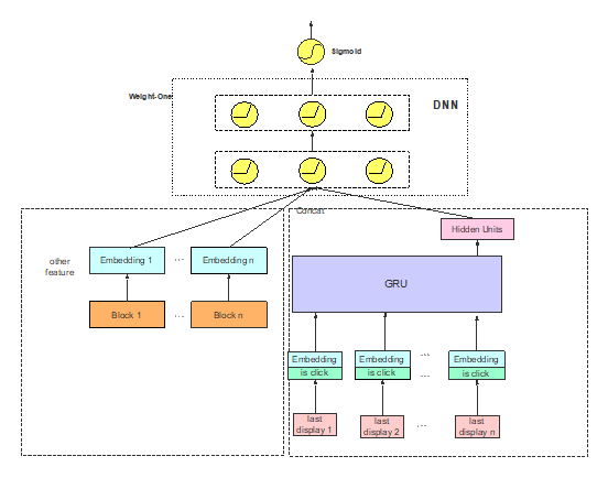 o Last Display 经过 Embedding 后与是否点击结合,再进入 GRU 模块,最后状态当做 DNN 输入;