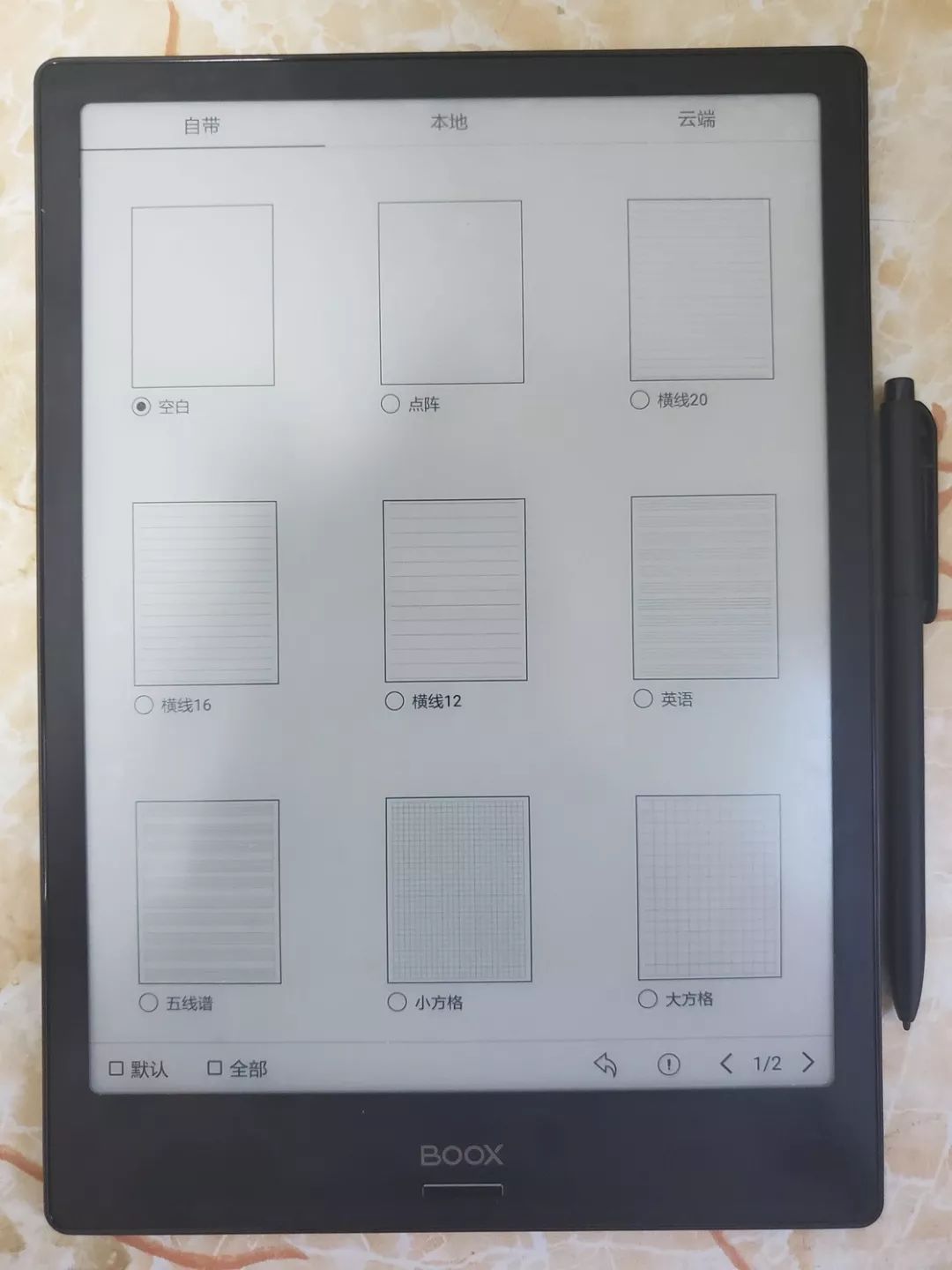 在手绘方面,文石 BOOX Note 也是比较认真的。为了弥补电子墨水屏天生的低刷新率缺陷,其支持 A2 刷新模式,降低残留拖影痕迹。其笔记界面支持绘制形状、套索旋转移动、插入文本,还可以更换背景为横线、方格、英文、五线谱、田字格、计划本等模板,练字写歌都靠它。