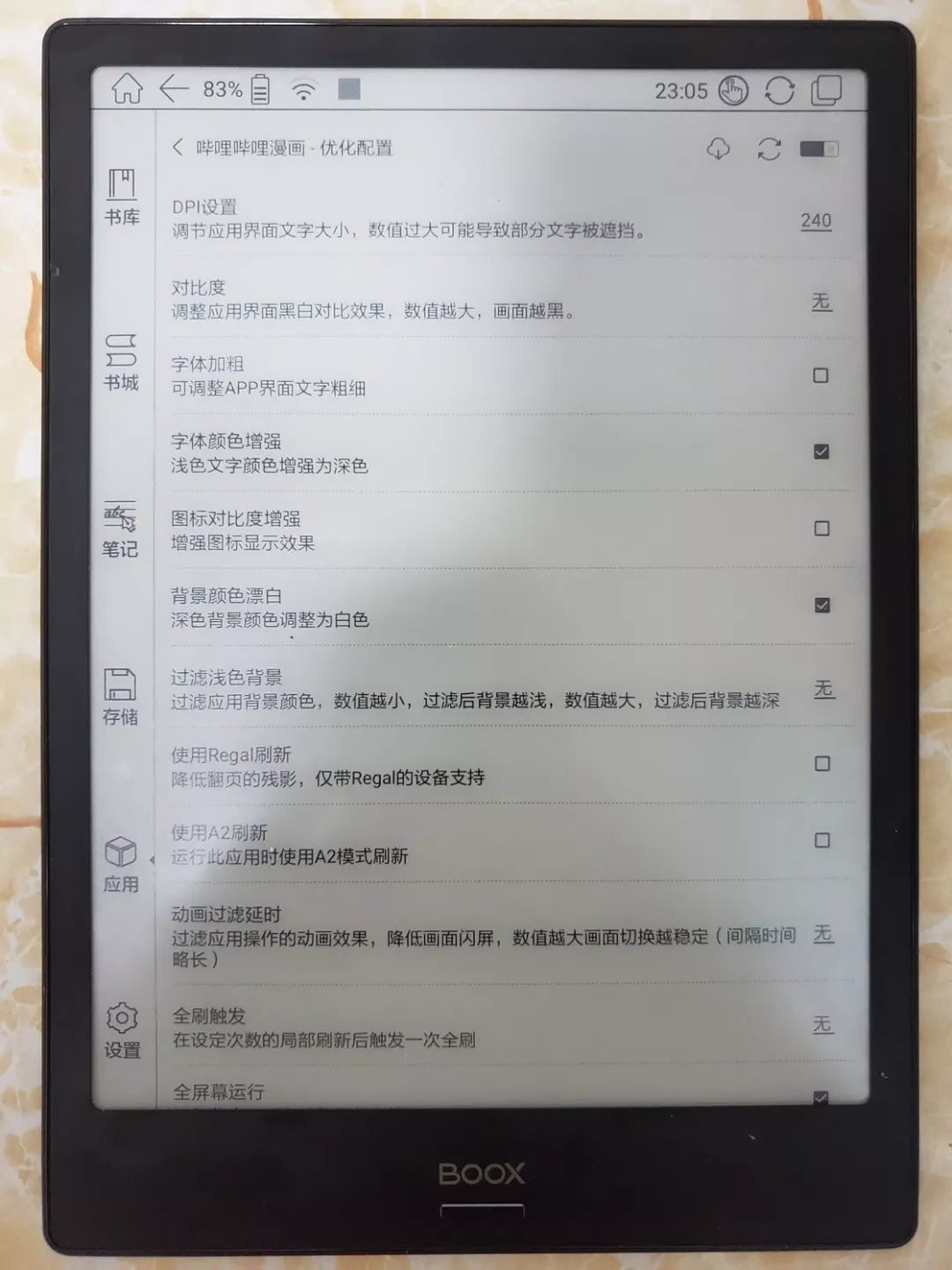 对于非应用商店安装的第三方 App,文石 BOOX Note 还提供了详尽的显示优化选项。例如增强对比度、调整 DPI、文本字体加粗和颜色加深、过滤浅色背景和动画效果等,让 App 在电子墨水屏上使用时更舒心。