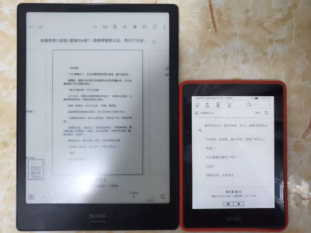 如果你不喜欢自带的书城,可以在应用商店中自行下载 Kindle App。与我的正牌 Kindle Voyage 相比,文石 BOOX Note 从尺寸上就赢得一局,大屏让阅读更舒适。但如果你的手比较小或希望塞进口袋随身携带,这也可能成为减分项。
