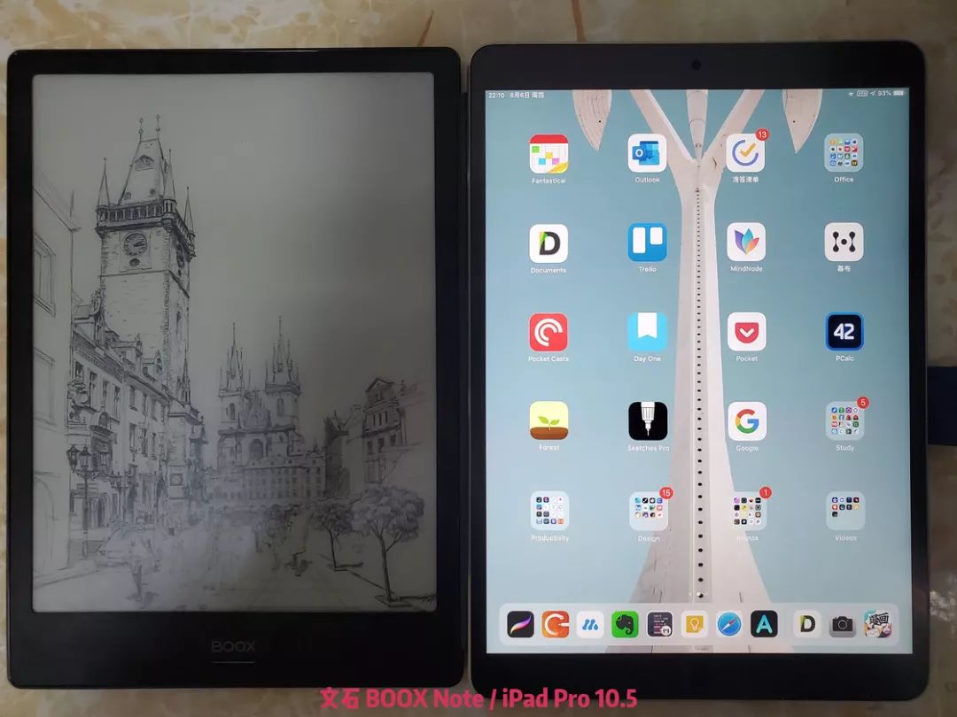 与我的 469 克的 10.5 英寸 iPad Pro 相比,文石 BOOX Note 的重量仅有 325 克,握持更轻松,躺床上举高高时也不用担心砸到脸会毁容。其厚度同样只有 6.8 毫米,在尺寸和重量间达到了比较完美的平衡,符合其介于 iPad Pro 与 Kindle 之间的定位。