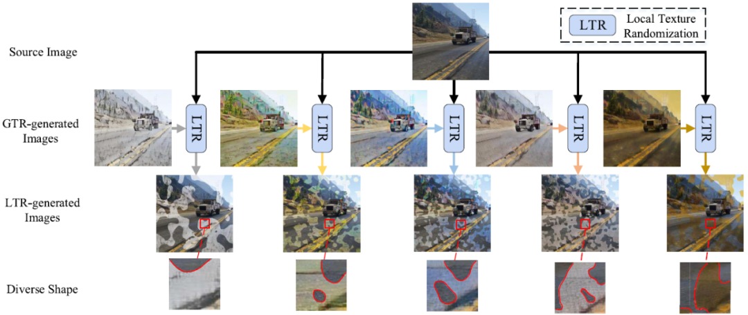GTR倾向于使网络完全忽略纹理信息,它确实增强了模型对纹理移动的鲁棒性,但也阻止了网络利用一些有价值的纹理线索。事实上,在大多数情况下,图像中只有一些局部区域存在纹理差异。如图3所示,只有红色掩蔽区域的纹理差异较大,其他区域的纹理差异较小。因此,我们提出了局部纹理随机化(LTR)来应对这种情况。由于这些局部区域通常具有任意形状,因此LTR生成具有随机边界的局部纹理随机区域(如图4所示),可以使CNN在各种不同的局部纹理场景下获得良好的性能。