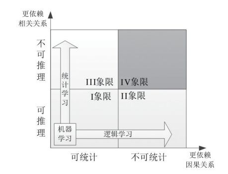 对于机器学习,第 I 象限属于最容易处理的领域,既有足够的先验数据作为学习样本,又有一定的逻辑规则指导学习算法,例如会下棋的AlphaGo机器人就是这个方面的典型案例。与下棋这种“弱人工智能”不同,当前的机器学习正向第 II 象限和第 III 象限进发。有赖于神经网络算法、大数据分析等技术发展,机器学习在第 III象限(这时称为深度学习)展示出远超出人类的处理能力:在这里机器将包括数值在内的各种类型数据(如文字、图像、语言、音频等)作为学习对象,从中提取数据特征,抽象运算模型,从而获取知识,最后实现规律总结或趋势预测,据此它在语言翻译、自动驾驶、预防犯罪等众多应用领域显示出超乎预料的神奇效果。在这个象限中,用于数理统计的相关性显然占据了上风,甚至可以这样说:在拥有大数据的情况下,因果性已不再那么重要,相关性才是关键。与第III象限的情况类似,机器也被认为能够在“举一反三”的逻辑推理方面展示出强大能力:尽管当今机器在这个方面还显得捉襟见肘(甚至有人宣称逻辑的人工智能已经死亡),但类似“零样本学习”“多值逻辑”“模糊计算”等方法的运用或许能让未来机器人在这个方向上展示出应有的魅力。但是,要实现“强人工智能”,机器人就要像人一样具有“思想”,这时机器学习就需要突破认知的第IV象限。尽管机器学习已经尝试触及第IV象限(例如绘画艺术),但从战争指挥的角度而言,为了防止“黑天鹅效应”等情况发生,还是希望机器受控的。